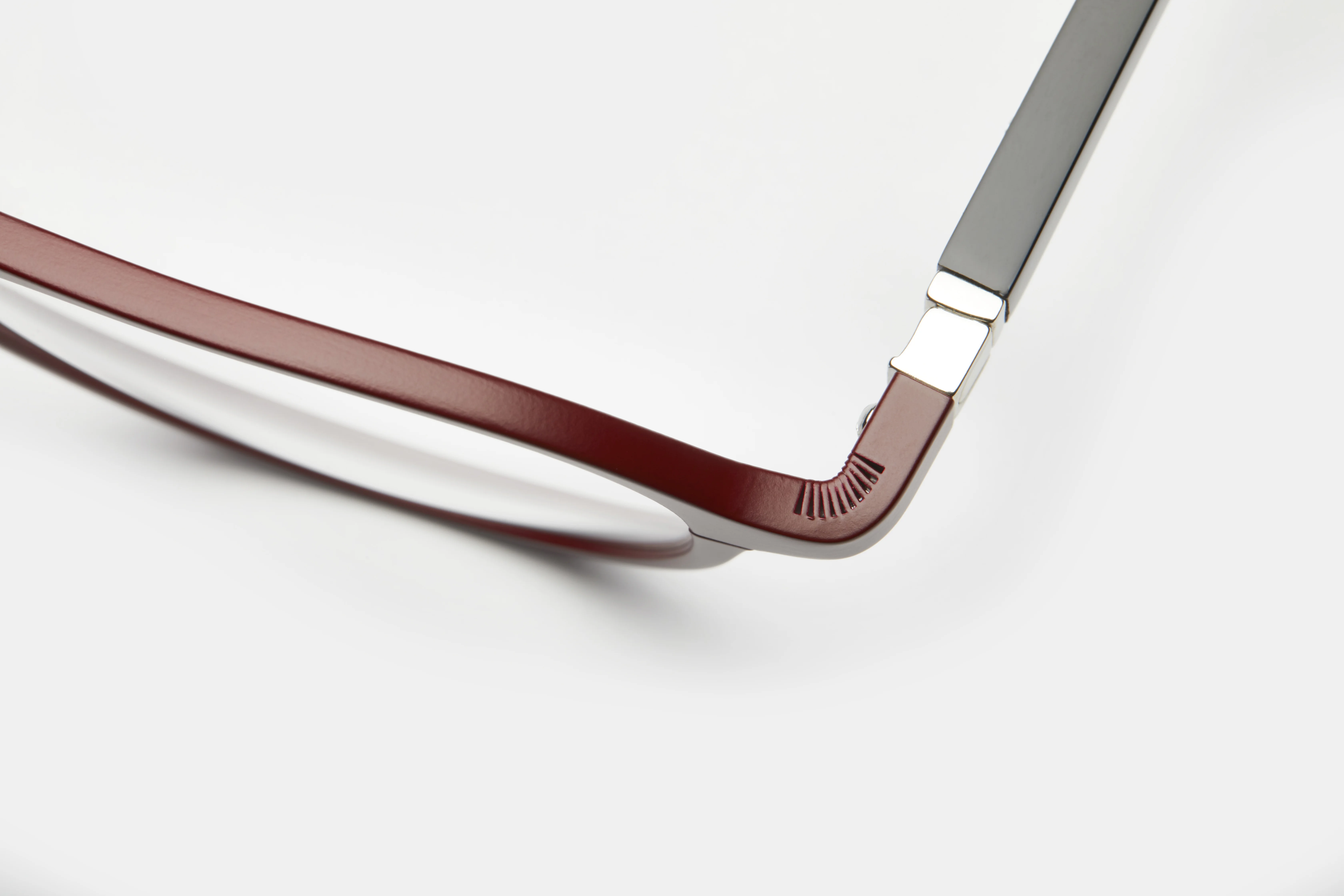 • This design is made in France with a three-dimensional “Gear” flex hinge. The hinge allows the temple to flex both horizontally and vertically, for perfect comfort and strength.